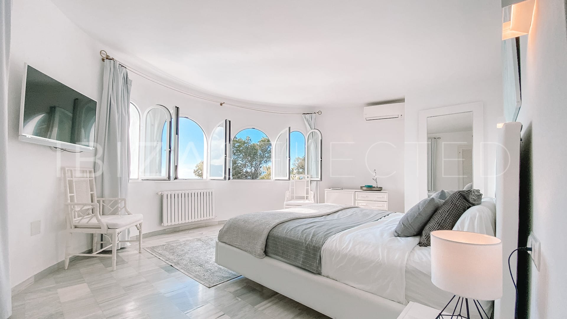 The two-storey, opulently designed main house of 400 sqm impresses first upon entering with its new and ultra-modern kitchen. Fully equipped and just recently finished in autumn 2019, its minimal design shows both style and class. We are happy to provide Breakfast Service or Private Chef on request for your stay to fulfill all your culinary wishes. Three of the adjacent open plan living and dining areas feature large window walls. Everything is dominated by the magical brightness of the sunlight and the view of the beautiful, underlying island. The large round salon with fireplace invites you to linger even on summer evenings and is perfect for an aperitif with guests before having dinner together or starting the long evenings through Ibiza’s famous nightlife.