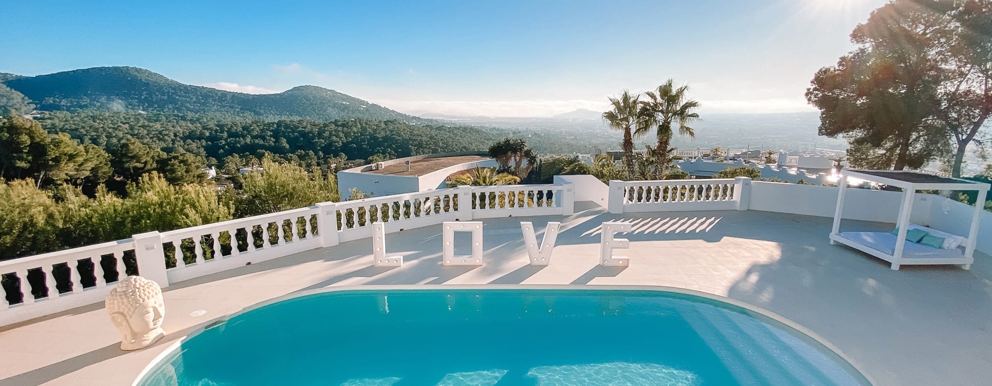 Ibiza reveals its best side to the guests of the house here: magical colours paint beautiful images and surreal beauty in the evening sky. Thanks to its big size, the pool deck is suitable for celebrations of all kinds. Whether it’s birthdays, corporate receptions or seated wedding dinners, there’s plenty of space for you and your guests. The saltwater pool itself is equipped with an LED multicolour system and can be tailored to adapt to/to suit the environment according to day or nighttime. Drop into the soft cushions of the large white Balinese sun bed and relax from the stressful daily routine at home.