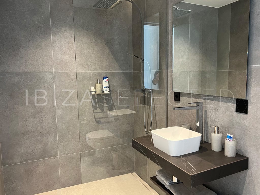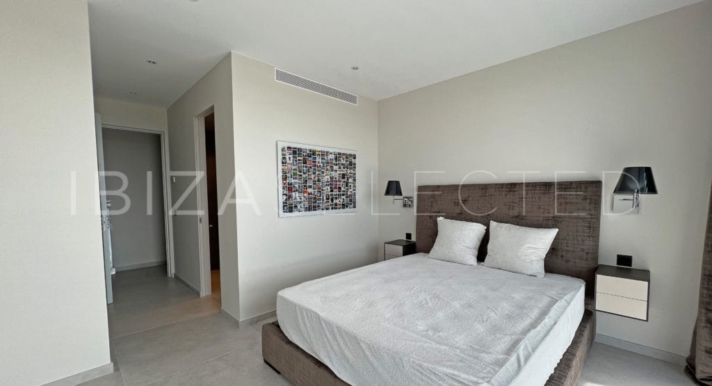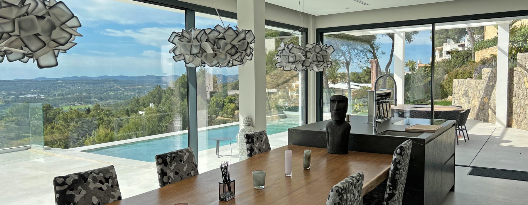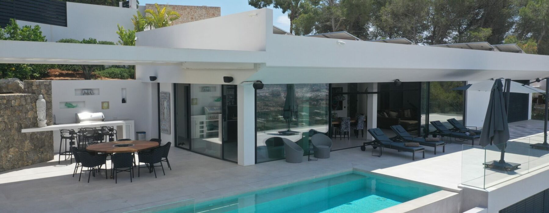 This villa is located in one of the most sought-after areas of Ibiza. Overlooking the Mediterranean Sea and Dalt Vila, the views are second to none. You will find the villa in Can Furnet, just a few minutes’ walk from the bay of the same name. The Botafoch marina and the center of Ibiza Town are also just a few minutes away. The residence has an area of almost 400 m2, distributed over three floors with 4 double bedrooms and 5 bathrooms. The immaculate white villa has a modern character with its clean lines and black window frames. High quality materials have been used and the elevator provides access to all floors. Characteristic are the large windows, the incoming natural light and the effortless transition between outside and inside. The living room is spacious and separated from the swimming pool by a sliding door.