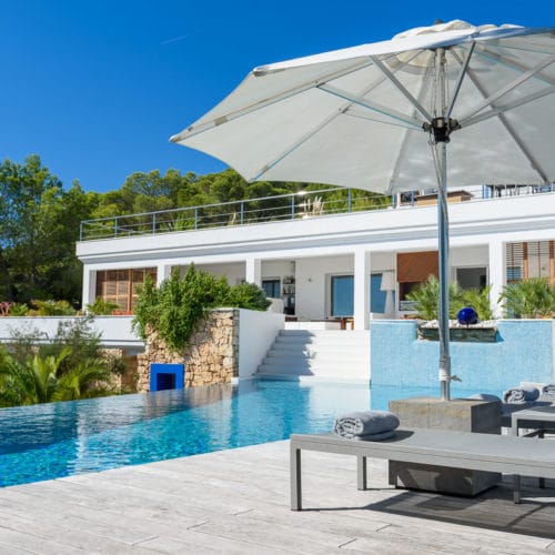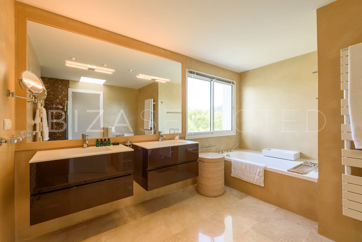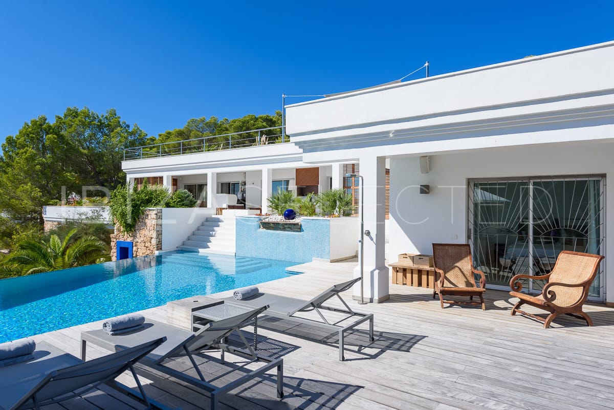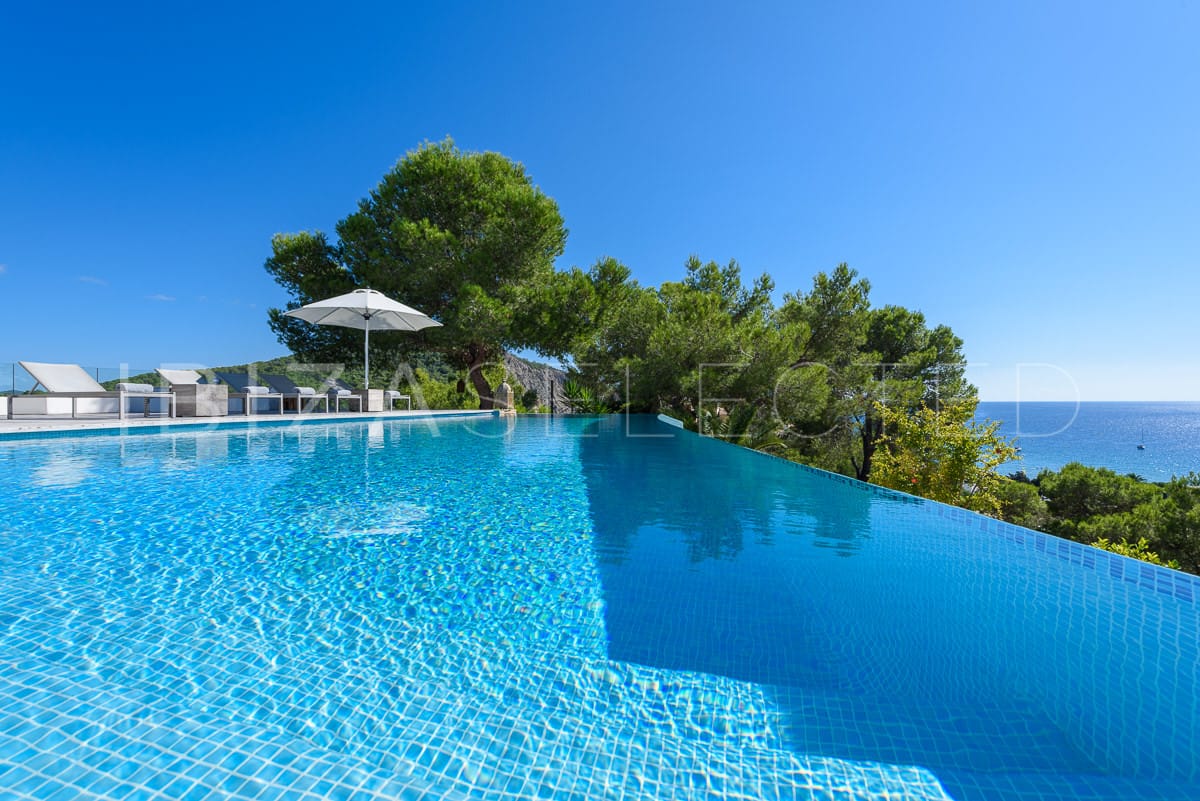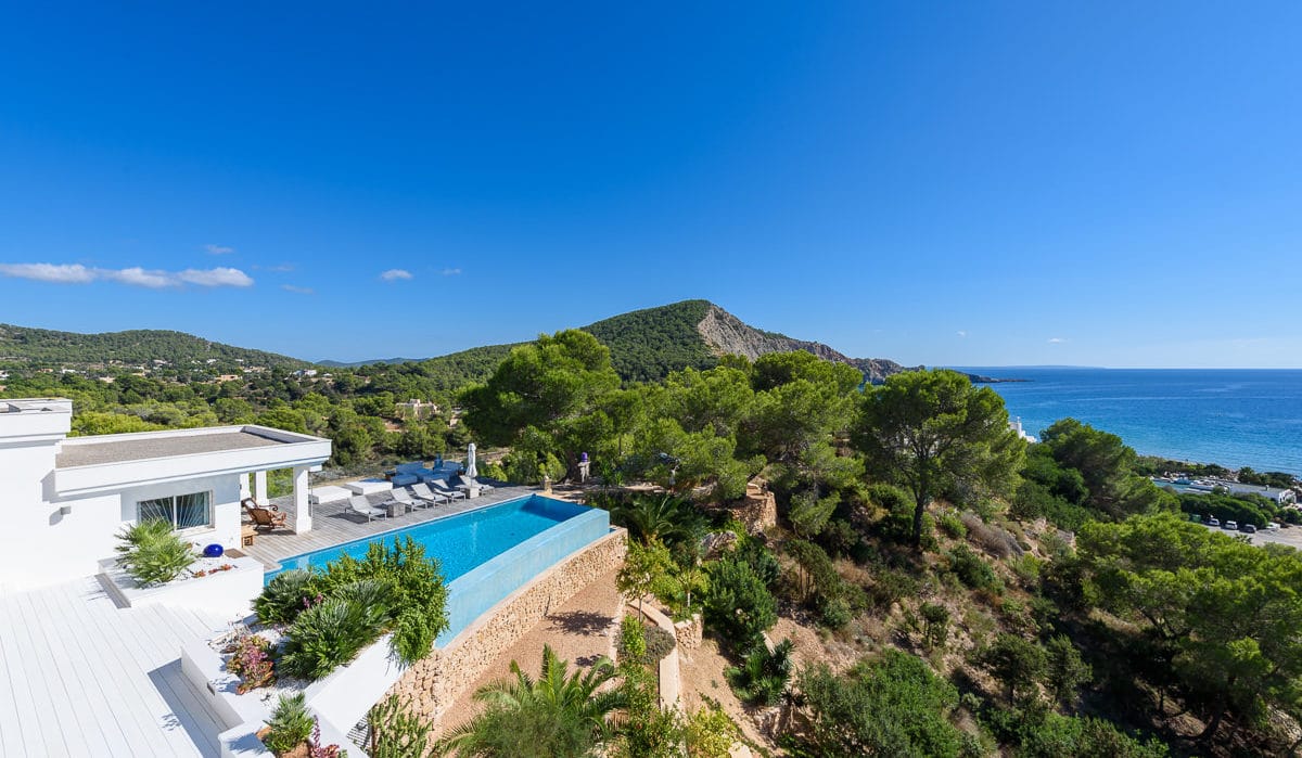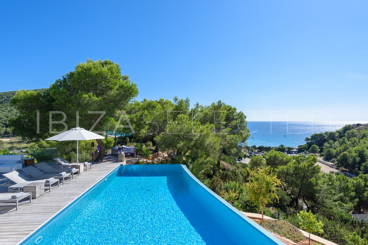 Villa Evelyn is an elegant and contemporary home located on a gorgeous hillside above Cala Jondal beach, famous for its Blue Marlin beach club. The pine-clad landscape drops onto the sparkling turquoise Mediterranean waters. Here you can relax in total privacy and absorb the outstanding views directly from the salt-water infinity pool as well as from any garden terrace spot. The large exterior terrace offers shaded seating and dining spaces, as well as a fully-equipped outdoor summer kitchen. A further shaded chill-out space is available on a wooden terrace built under the fragrant pine trees, or you can even venture up to the roof for a whole new set of sun-drenched entertaining spaces. Inside, elegant living areas stretch from the large open-plan lounge and dining area through to the well-equipped kitchen and the large terrace overlooking the pool. The four double bedrooms are all en-suite and incredibly spacious with a fresh, clean and bright finish as with the rest of the property.