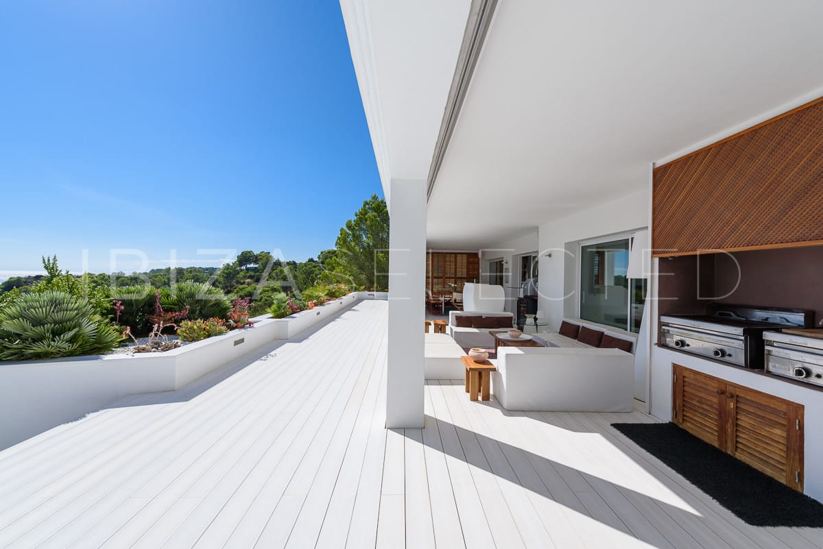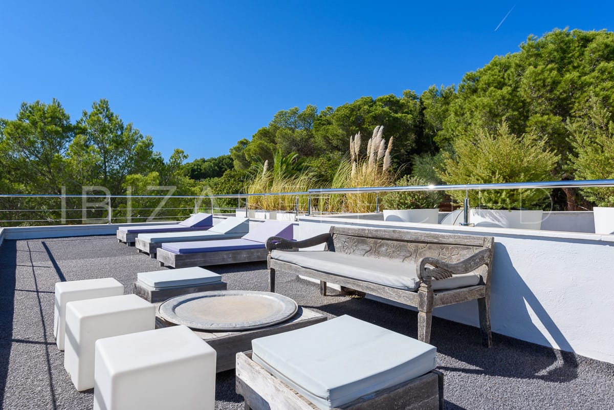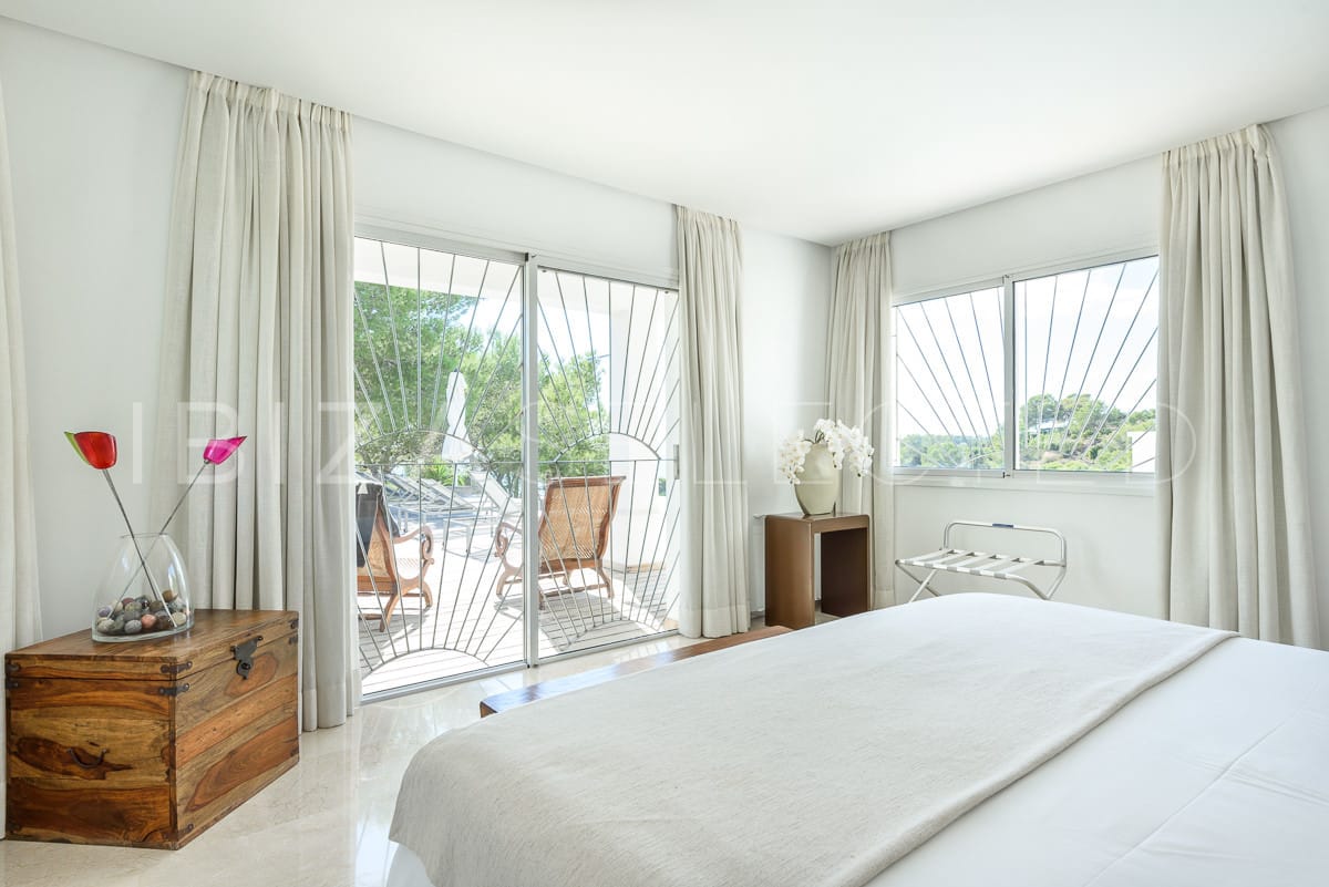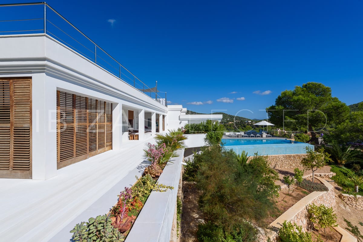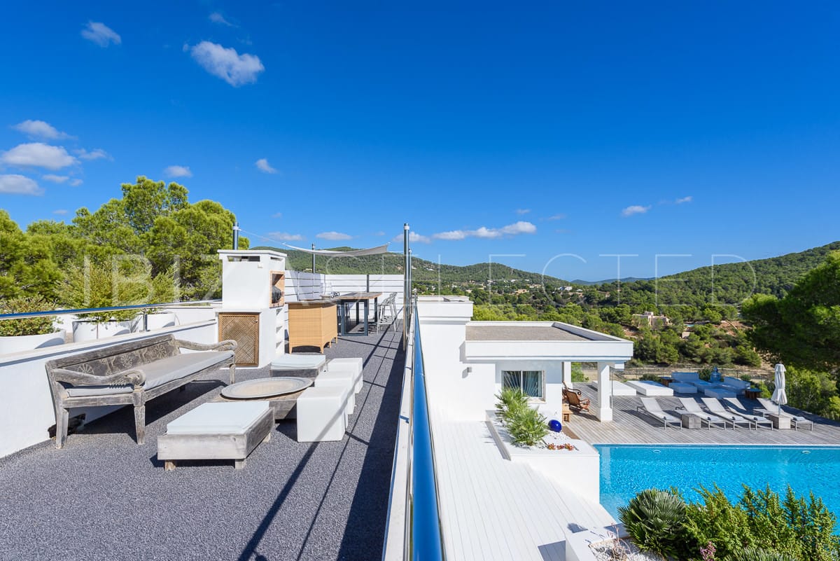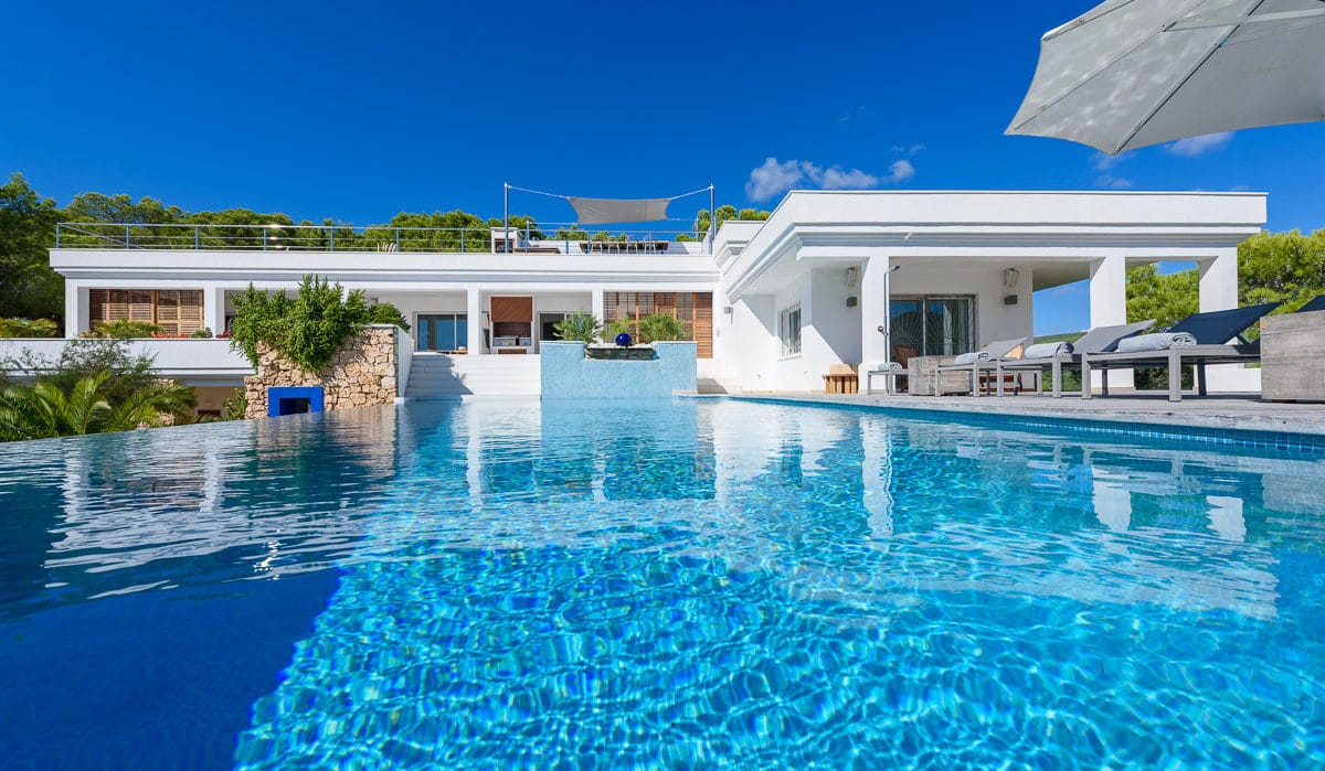 Villa Evelyn is an elegant and contemporary home located on a gorgeous hillside above Cala Jondal beach, famous for its Blue Marlin beach club. The pine-clad landscape drops onto the sparkling turquoise Mediterranean waters. Here you can relax in total privacy and absorb the outstanding views directly from the salt-water infinity pool as well as from any garden terrace spot. The large exterior terrace offers shaded seating and dining spaces, as well as a fully-equipped outdoor summer kitchen. A further shaded chill-out space is available on a wooden terrace built under the fragrant pine trees, or you can even venture up to the roof for a whole new set of sun-drenched entertaining spaces. Inside, elegant living areas stretch from the large open-plan lounge and dining area through to the well-equipped kitchen and the large terrace overlooking the pool. The four double bedrooms are all en-suite and incredibly spacious with a fresh, clean and bright finish as with the rest of the property.