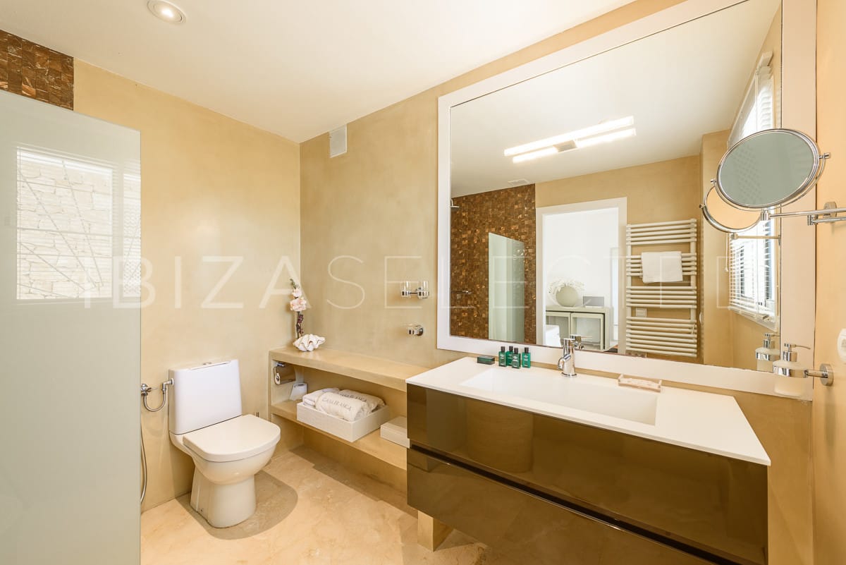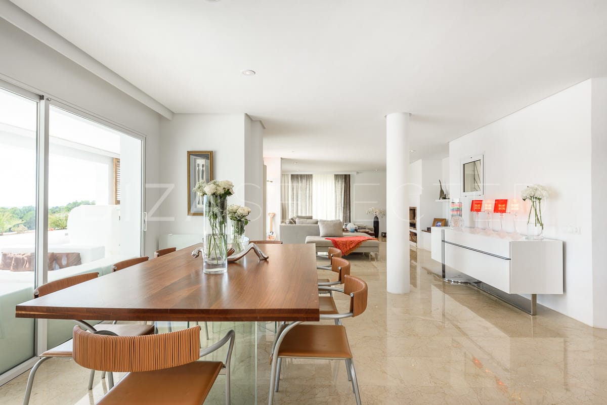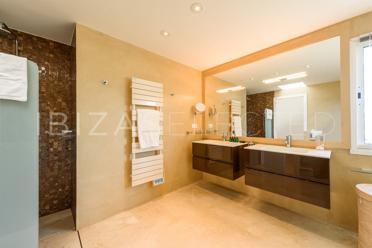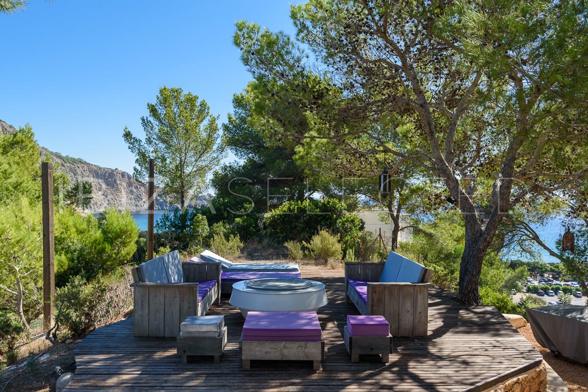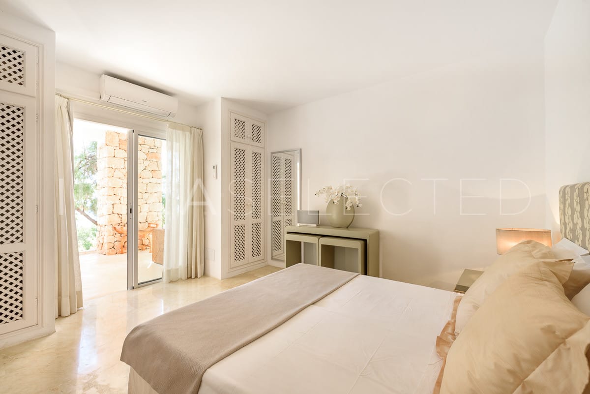 Villa Evelyn is an elegant and contemporary home located on a gorgeous hillside above Cala Jondal beach, famous for its Blue Marlin beach club. The pine-clad landscape drops onto the sparkling turquoise Mediterranean waters. Here you can relax in total privacy and absorb the outstanding views directly from the salt-water infinity pool as well as from any garden terrace spot. The large exterior terrace offers shaded seating and dining spaces, as well as a fully-equipped outdoor summer kitchen. A further shaded chill-out space is available on a wooden terrace built under the fragrant pine trees, or you can even venture up to the roof for a whole new set of sun-drenched entertaining spaces. Inside, elegant living areas stretch from the large open-plan lounge and dining area through to the well-equipped kitchen and the large terrace overlooking the pool. The four double bedrooms are all en-suite and incredibly spacious with a fresh, clean and bright finish as with the rest of the property.