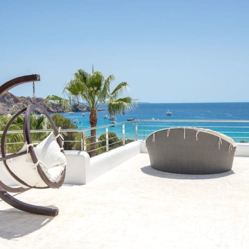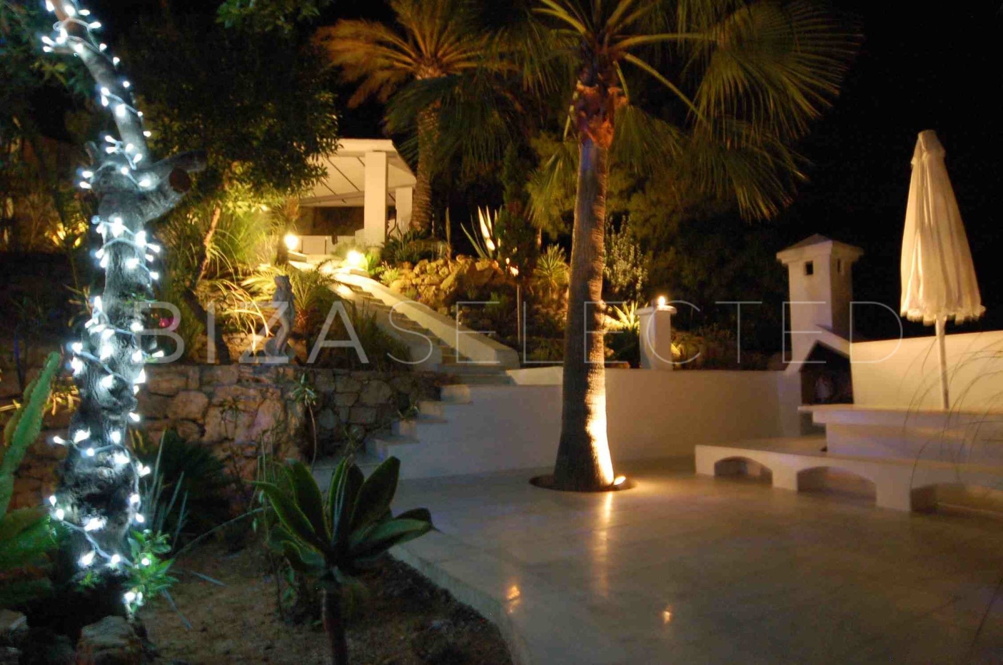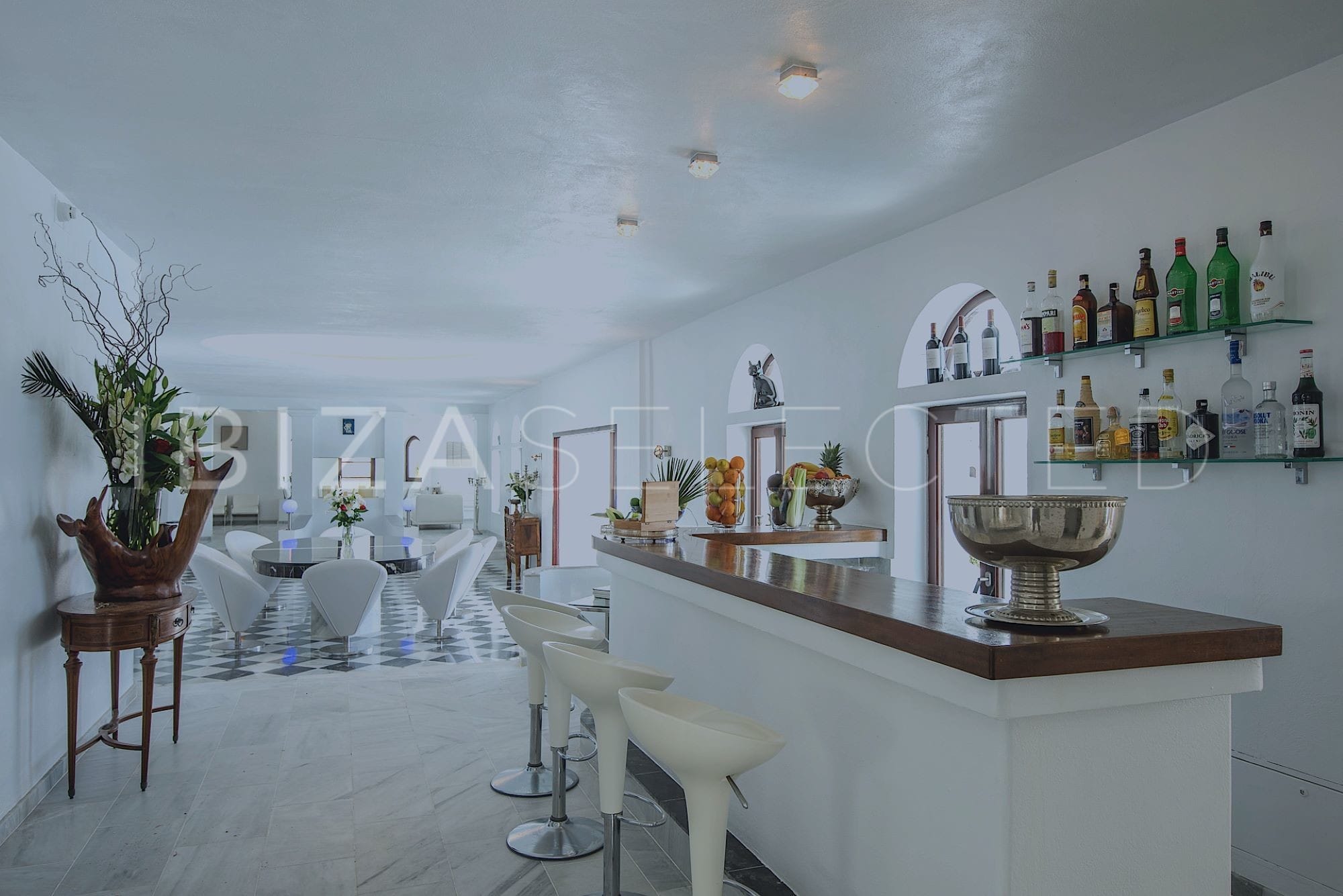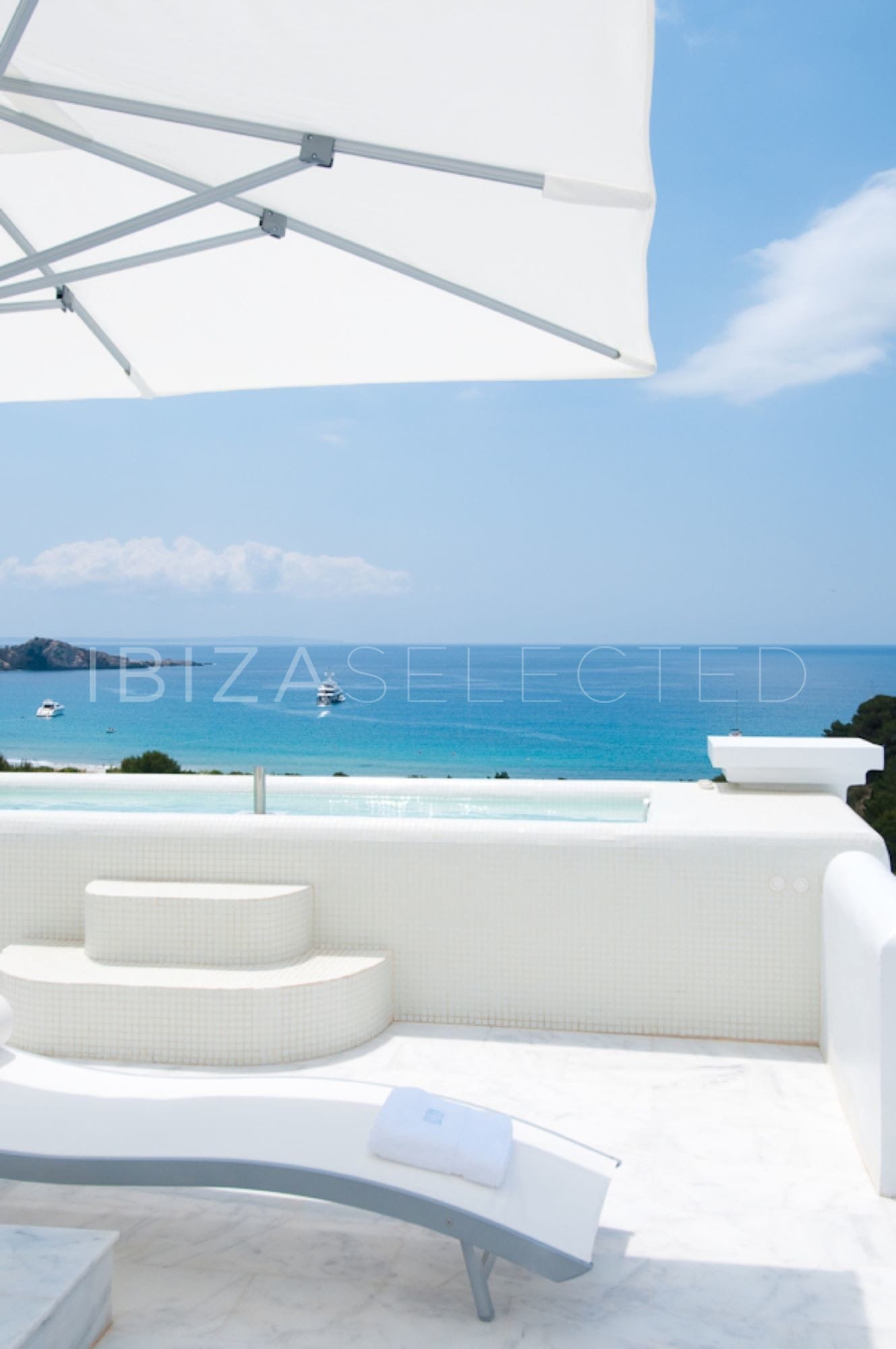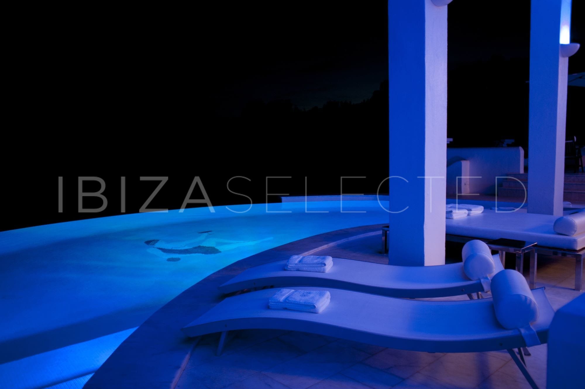 Die Villa hat 5 Schlafzimmer, jeweils mit Bädern en Suite, Plasma-TV, Soundsystem und Safe. Auf der Dachterrasse gibt es einen Designer-Whirlpool, ein perfekter Ort zum abschalten. Im Untergeschoss hingegen befindet sich ein komplett eingerichteter After-Hours-Club mit Unterwasserbar, Disco und Fenstern, durch die man in den beleuchteten Pool hineinblicken kann. Die Villa bietet verschiedene Lounge und Essbereiche an mit einer BBQ-Area unter Palmen, ein weiterer Essbereich für bis zu 12 Gäste befindet sich am Pool und ein Frühstücksraum mit Blick auf die Bucht von Cala Jondal. Das Haus ist mit einem Chef- und Butlerservice ausgestattet, die im Preis inbegriffen sind. Daneben stehen Ihnen ein Gym, eine Detox- Sauna und ein Dampfbad sowie ein Massagetisch zur Verfügung.