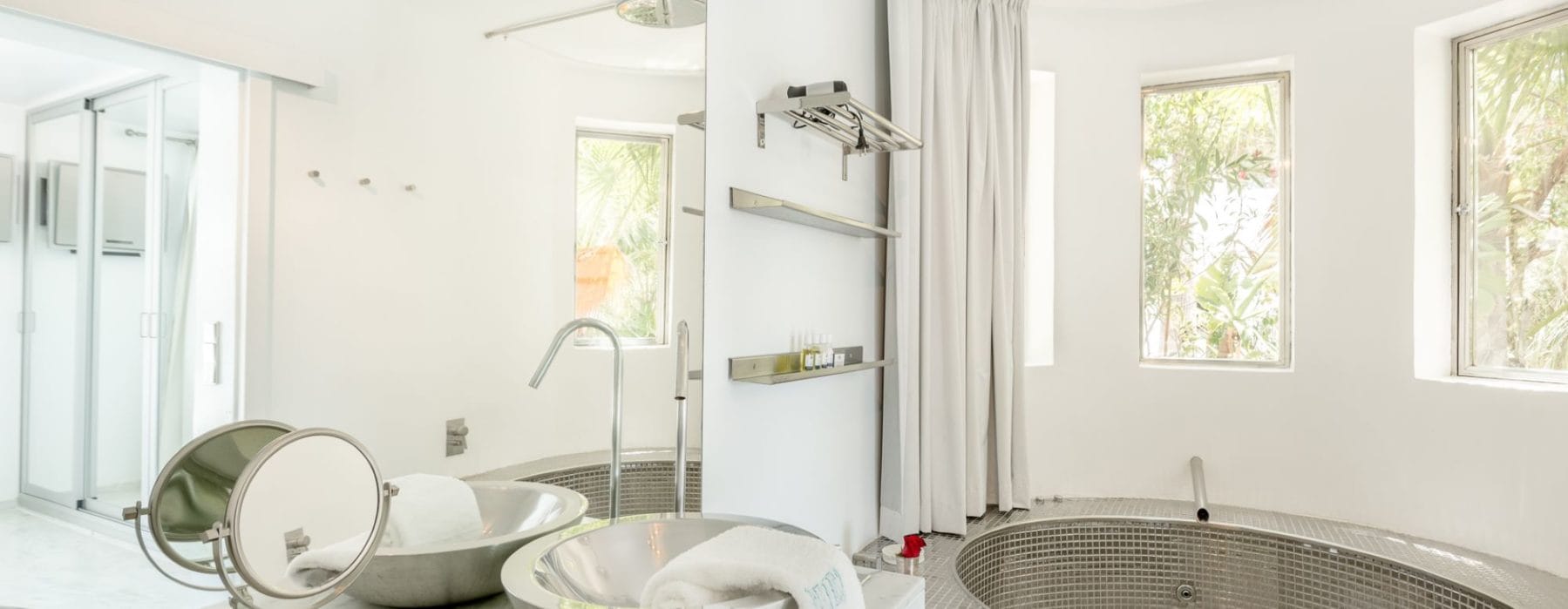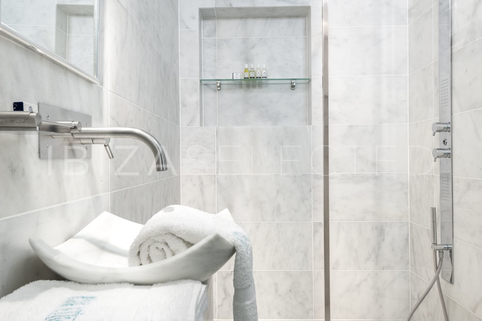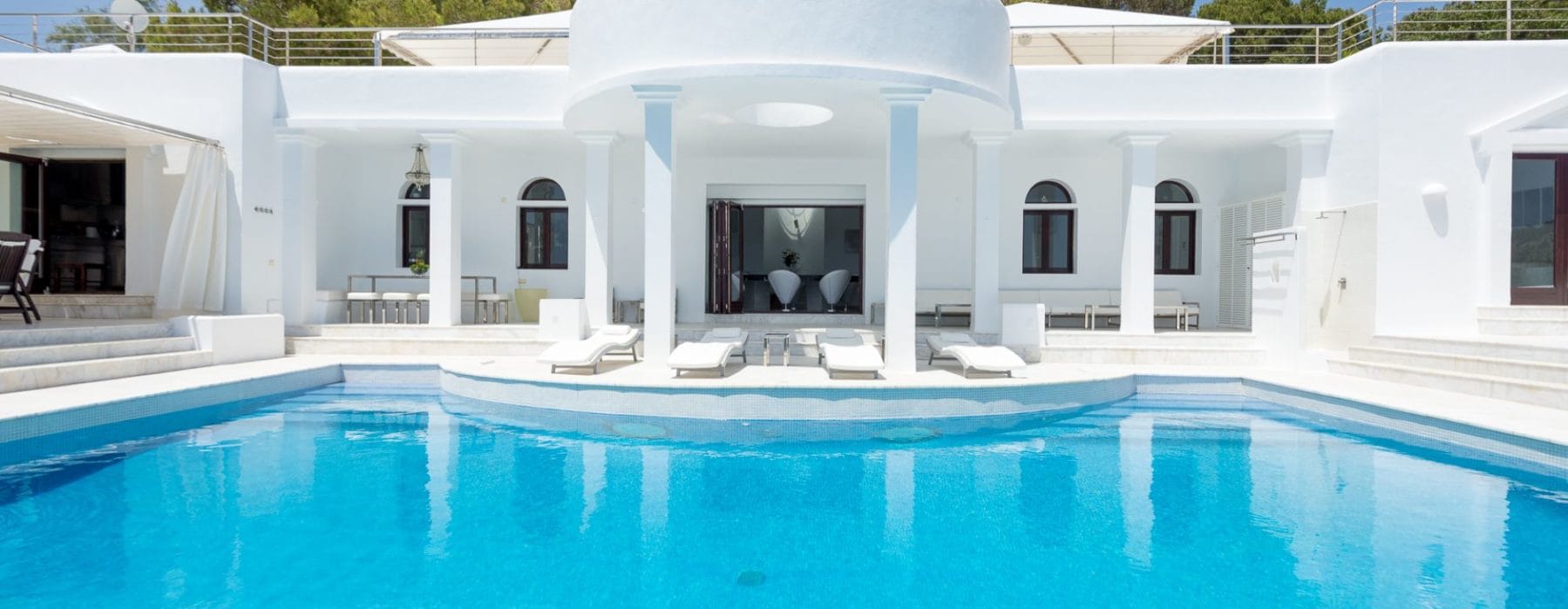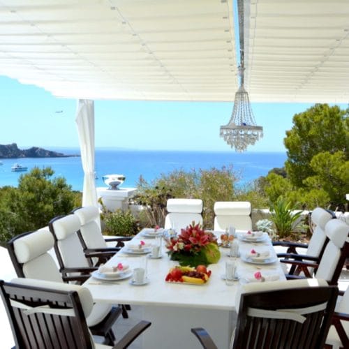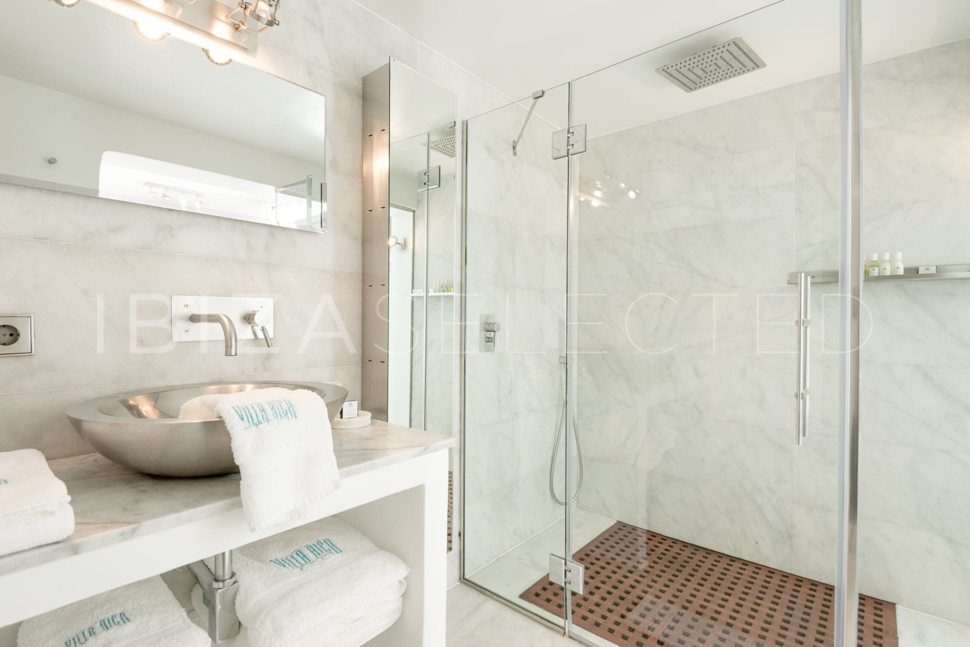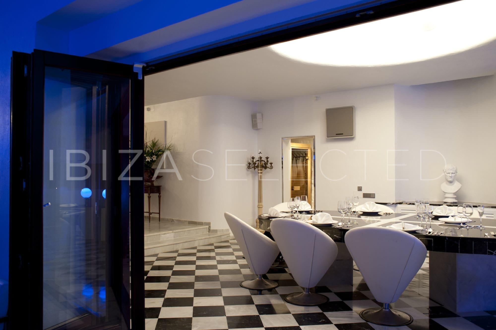 Die Villa hat 5 Schlafzimmer, jeweils mit Bädern en Suite, Plasma-TV, Soundsystem und Safe. Auf der Dachterrasse gibt es einen Designer-Whirlpool, ein perfekter Ort zum abschalten. Im Untergeschoss hingegen befindet sich ein komplett eingerichteter After-Hours-Club mit Unterwasserbar, Disco und Fenstern, durch die man in den beleuchteten Pool hineinblicken kann. Die Villa bietet verschiedene Lounge und Essbereiche an mit einer BBQ-Area unter Palmen, ein weiterer Essbereich für bis zu 12 Gäste befindet sich am Pool und ein Frühstücksraum mit Blick auf die Bucht von Cala Jondal. Das Haus ist mit einem Chef- und Butlerservice ausgestattet, die im Preis inbegriffen sind. Daneben stehen Ihnen ein Gym, eine Detox- Sauna und ein Dampfbad sowie ein Massagetisch zur Verfügung.
