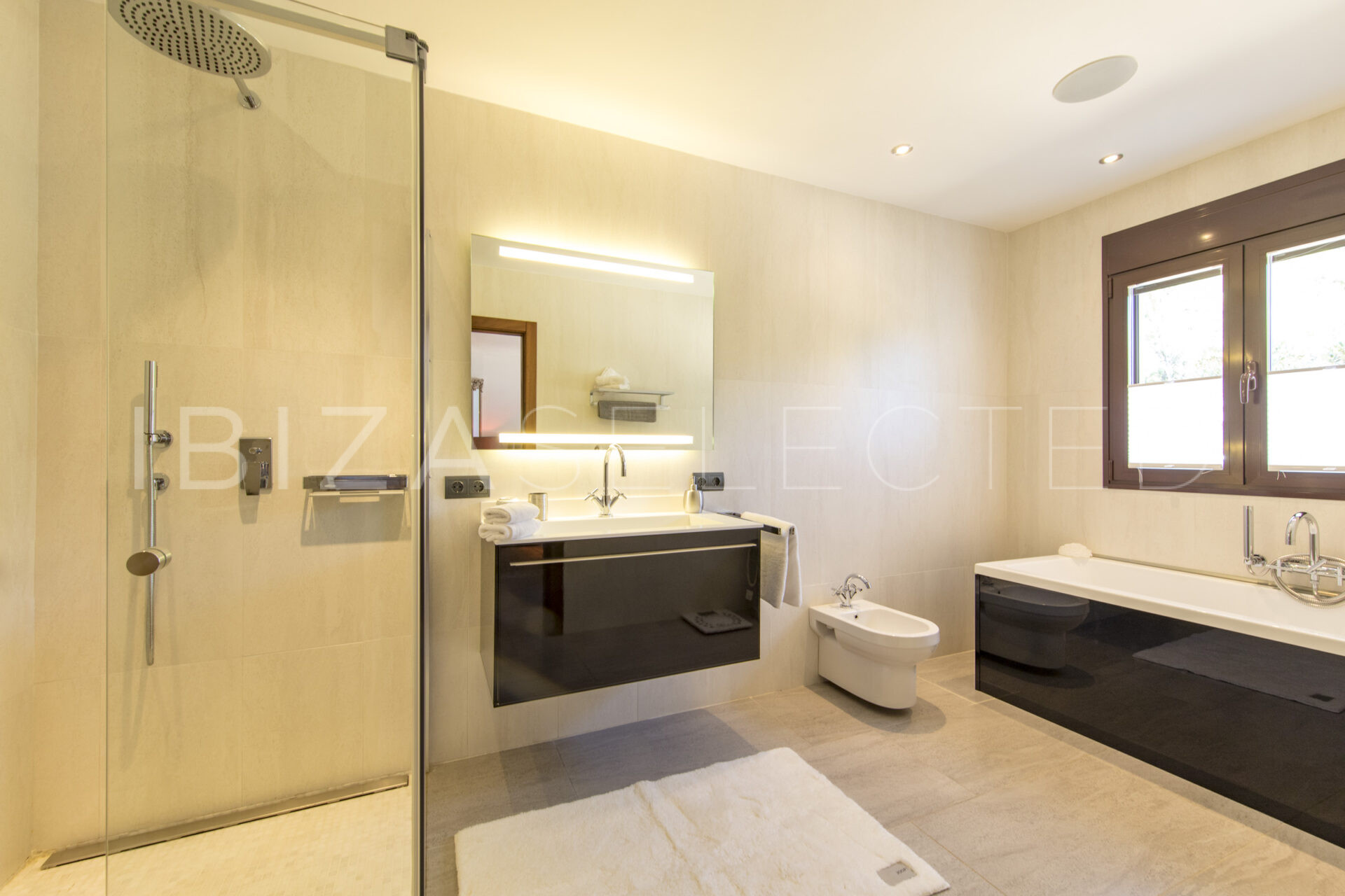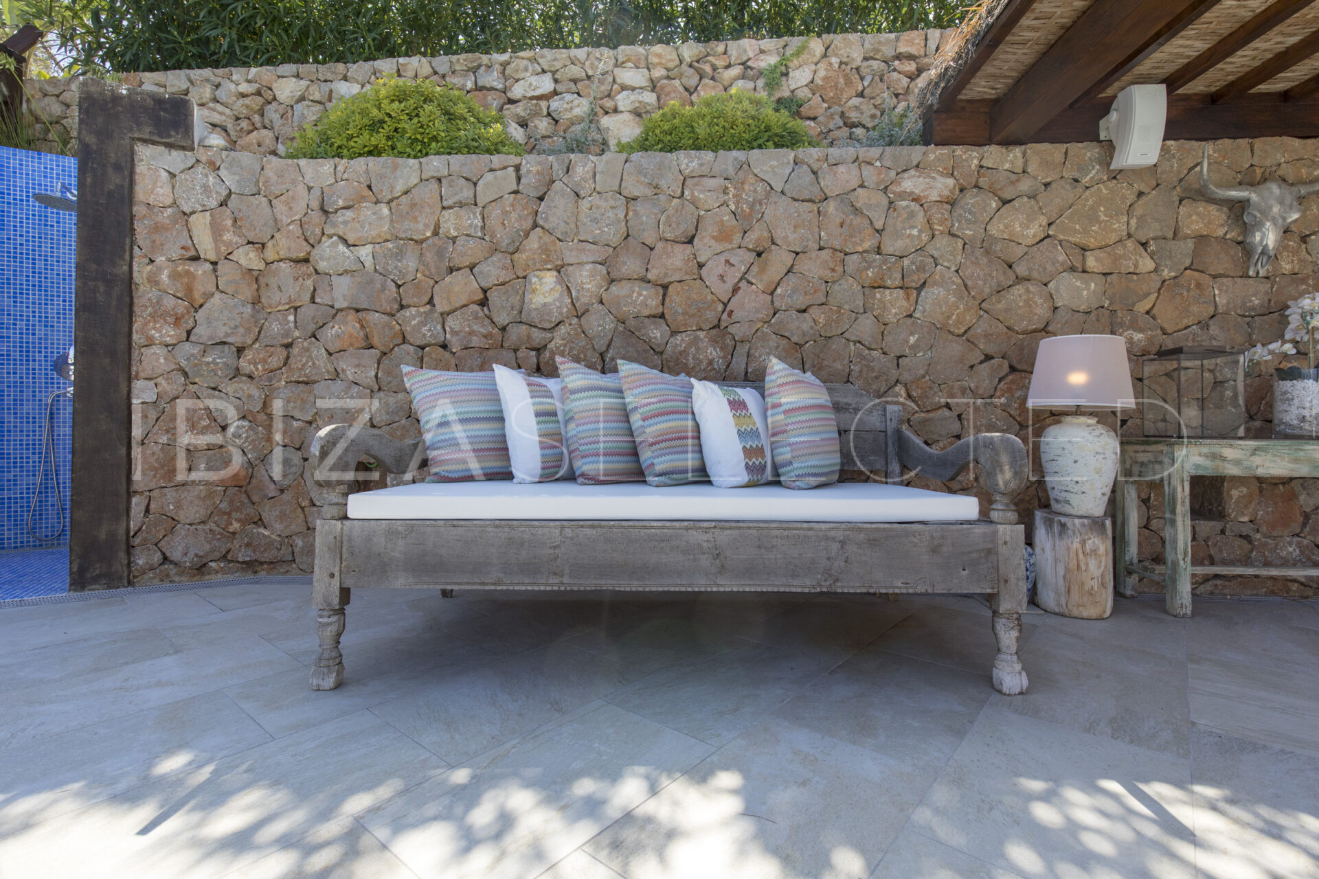 The property is located close to Santa Eulalia, not far from the marina and various beaches. The privileged location on a hillside offers 100% privacy. Ibiza Town is around a 25-minute drive away.