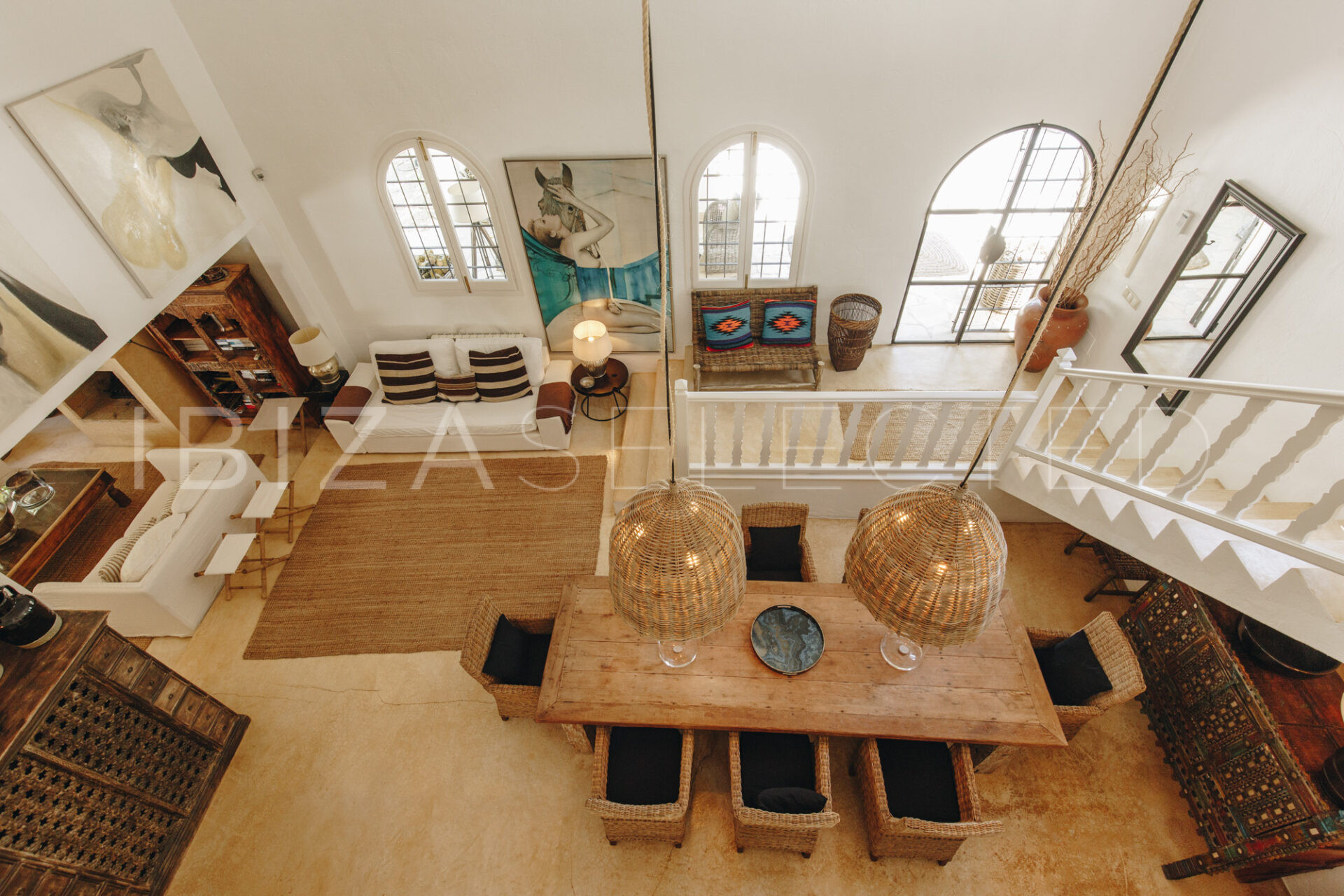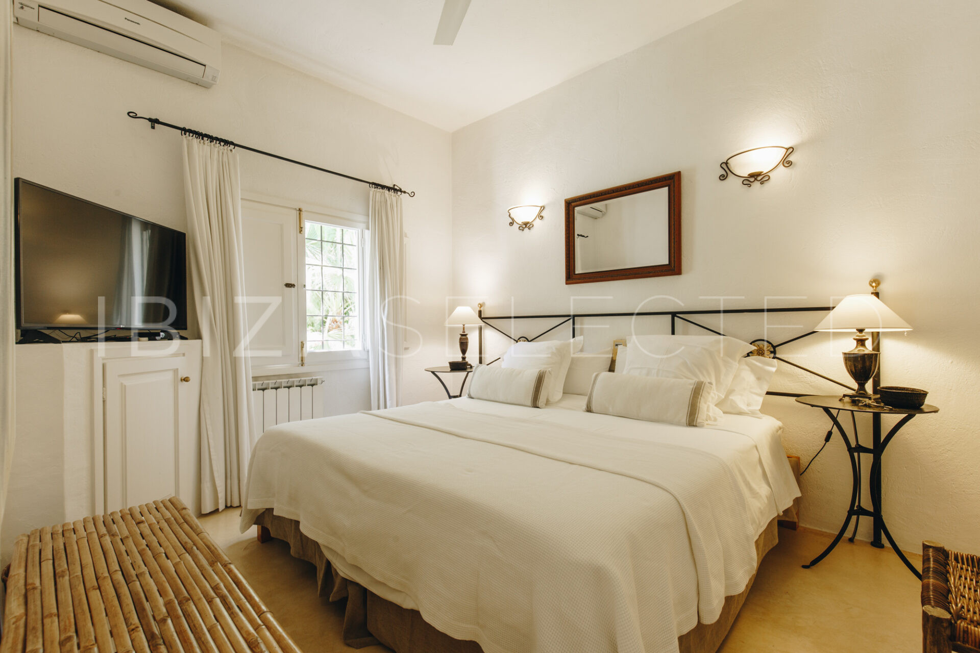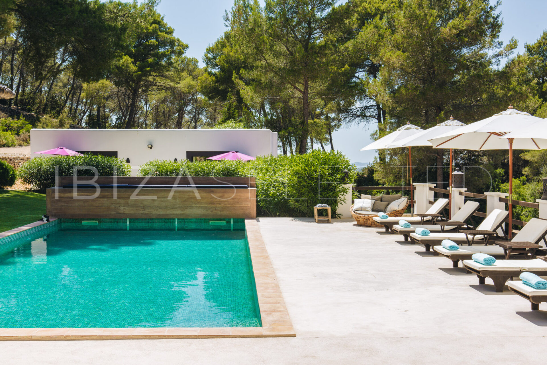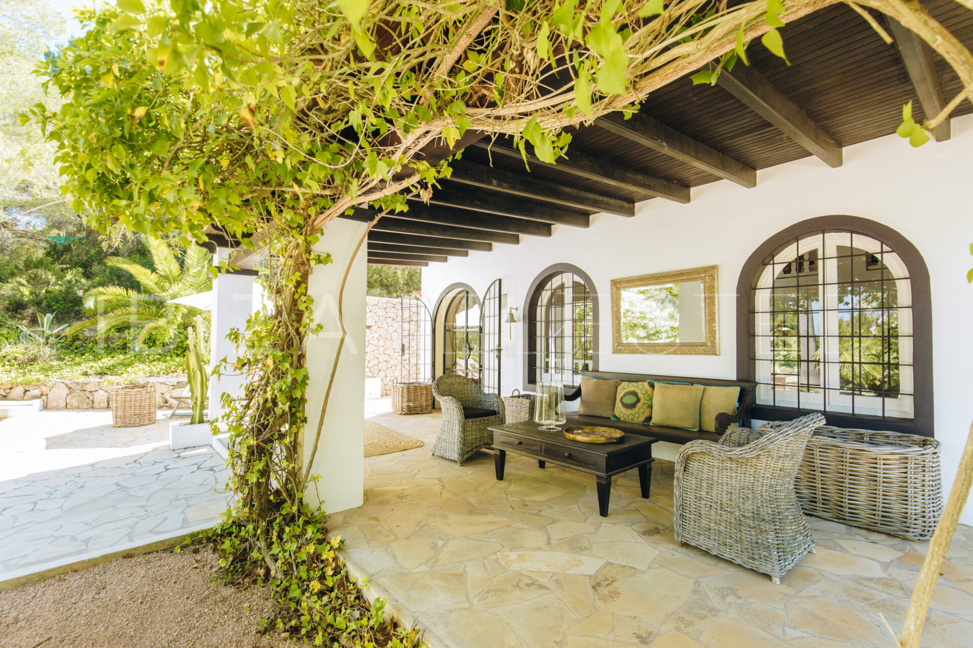 Villa Charo is a stunning 35000sqm countryside villa situated in the heart of the island on a 4-hectare plot providing loads of privacy and peace. This six-bedroom property is made to suit the Mediterranean climate with many sun-drenched or shaded chill-out areas, a fully fitted outdoor kitchen, a lounge corner, and, situated a few more meters away- a sunset view chillout area, perfect for an evening cocktail while enjoying a spectacular sunset ceremony. Inside, the tasteful decor features natural materials like wood and stone and blends with the highest quality furnishings and fittings. The living room that features a TV corner opens up to the dining area and a fully equipped kitchen. From the kitchen door, you can access another shaded sitting area and garden. Four spacious suites are located in the main house, one of them with additional external access. Two more ample and tasteful suites are located in the lower grounds across the pool area. Each of the bedrooms is equipped with a safety box and an alarm. The property is fully air-conditioned and has ceiling fans too, including a fan in the outdoor lounge. The sparkling mosaic pool invites for a refreshing dip followed by a tanning session or a break under one of the parasols. The pool can also be heated on request in the cooler months. Villa Charo is perfect for family groups with loads of grounds for children to play, a basketball hoop and a tennis table. The guests will enjoy the tranquility of the area while being a short drive away from the village of San Rafael with some of the best restaurants on the island including Coto and El Clodenis. The central location of the property will allow the guests to reach all main towns: Santa Gertrudis, Ibiza Town and San Antonio in a 10 minutes ride.